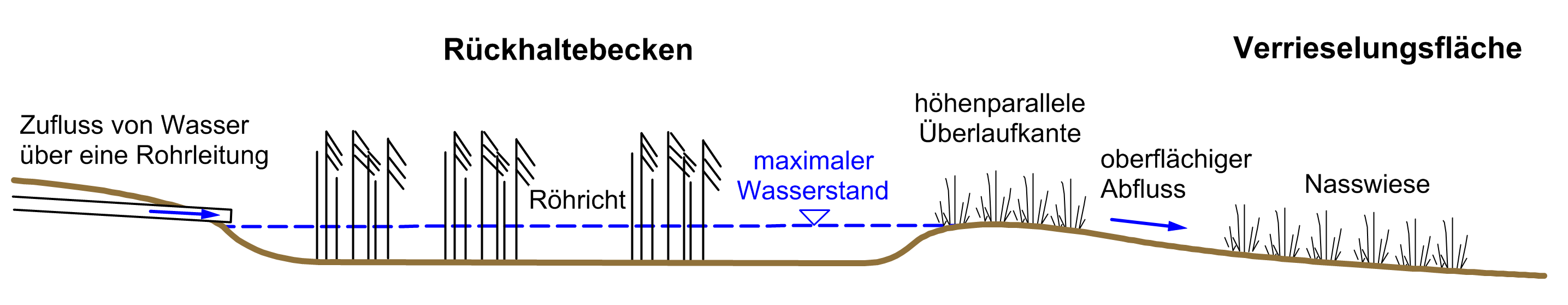 - Weiter unterhalb, östlich der Staatsstraße dient ein flaches Becken mit Wassereinstau (max. Wassertiefe 30 cm, max. Wasserfläche ca. 520 qm), das mit Röhricht bewachsen ist, der Reinigung von Oberflächenwasser bzw. speziell dem Rückhalt von partikulärem Phosphor. Der Abfluss aus dem Becken erfolgt breitflächig über eine höhenparallele Überlaufkante in eine Nasswiese, die als Rieselfläche dem Auskämmen von noch vorhandenen Phosphorteilchen dient. Die Wurzeln der Pflanzen verhindern einen erneuten Austrag.