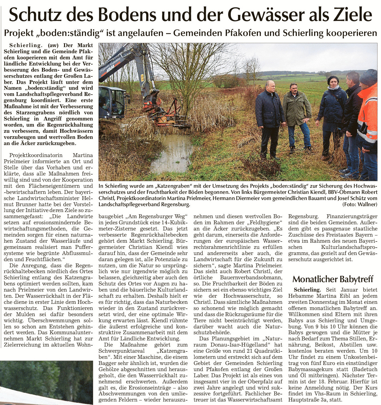 Das Schierlinger Regenrückhaltebecken am Starzengraben war schon stark zugewachsen und druch Einschwemmungen vergangener Hochwässer um einiges kleiner geworden. Auf der boden:ständig Infoveranstaltung hatten Landwirte den Zustand angesprochen. Schon einige Wochen später konnte der Zustand verbessert werden. Im Zuge von Maßnahmen zum Gewässerunterhalt wurden Gehölze zurückgenommen und Erdreich bewegt. Praktisch, dass der Landschaftspflegeverband Regensburg e. V. nicht nur das boden-ständig-Projekt betreut, sondern auch die Gewässerpflege organisiert. Mehr dazu ist im Zeitungsartikel im Download zu finden.