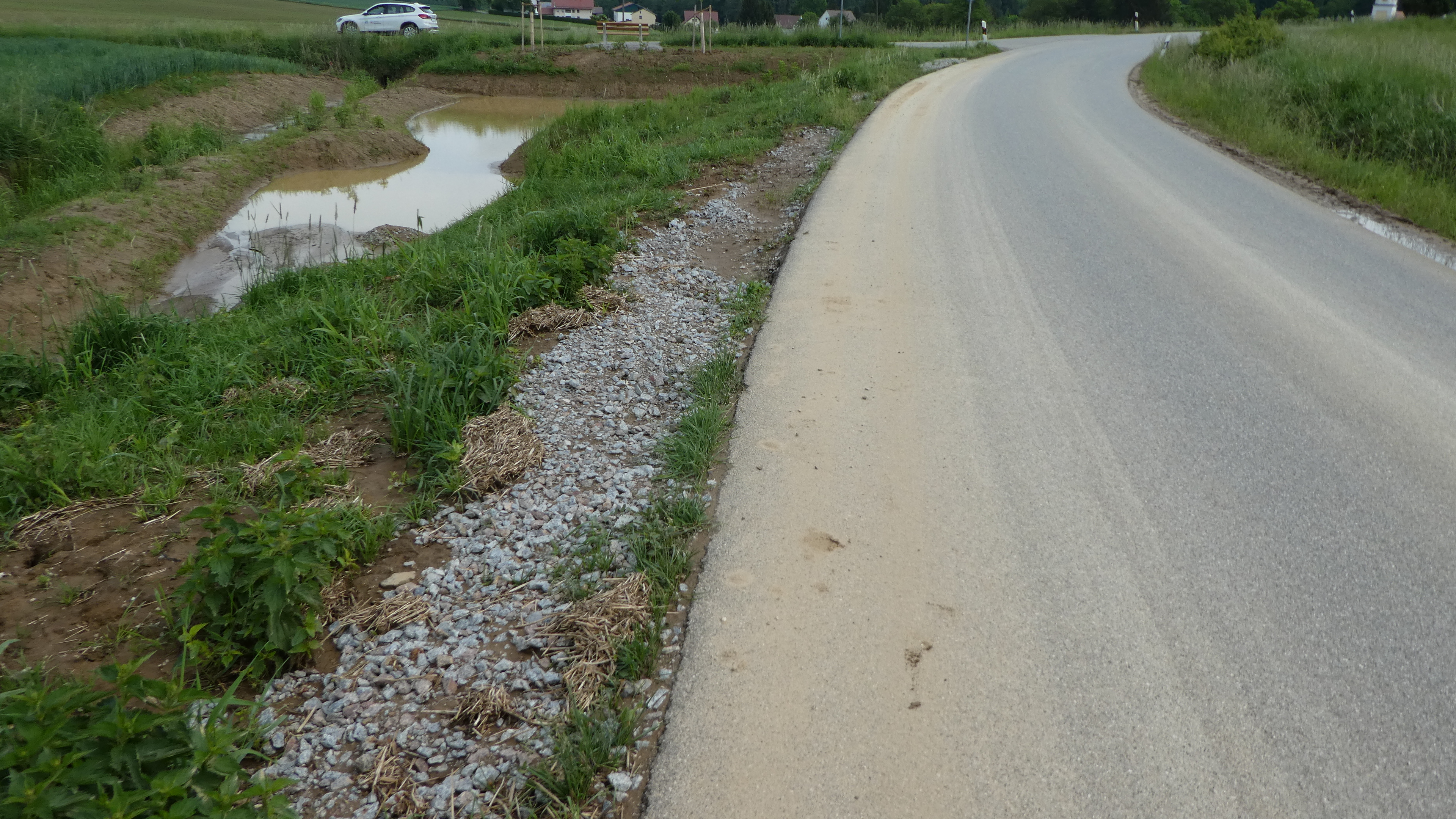 Gut, dass die im Rahmen der boden:ständig Konzeption entwickelte Grabenaufweitung mit Gehölzpflanzung ein paar Wochen vorher angelegt wurde. Denn jetzt konnte darin Wasser und Erdreich zurückgehalten werden. Ein schöner Beweis für die Funktionstüchtigkeit der über die Landschaftspflege- und Naturparkrichtlinie geförderten Maßnahme. Neben der Aufgabe als Retentionsfläche sind solche wechselfeuchten Flächen in der Landschaft ein echter Zugewinn vor allem für die Fauna. Und wenn sich in den nächsten Jahren auch die Heckenpflanzung üppig entwickelt hat, ist hier ein richtig schöner neuer Biotopbaustein entstanden.