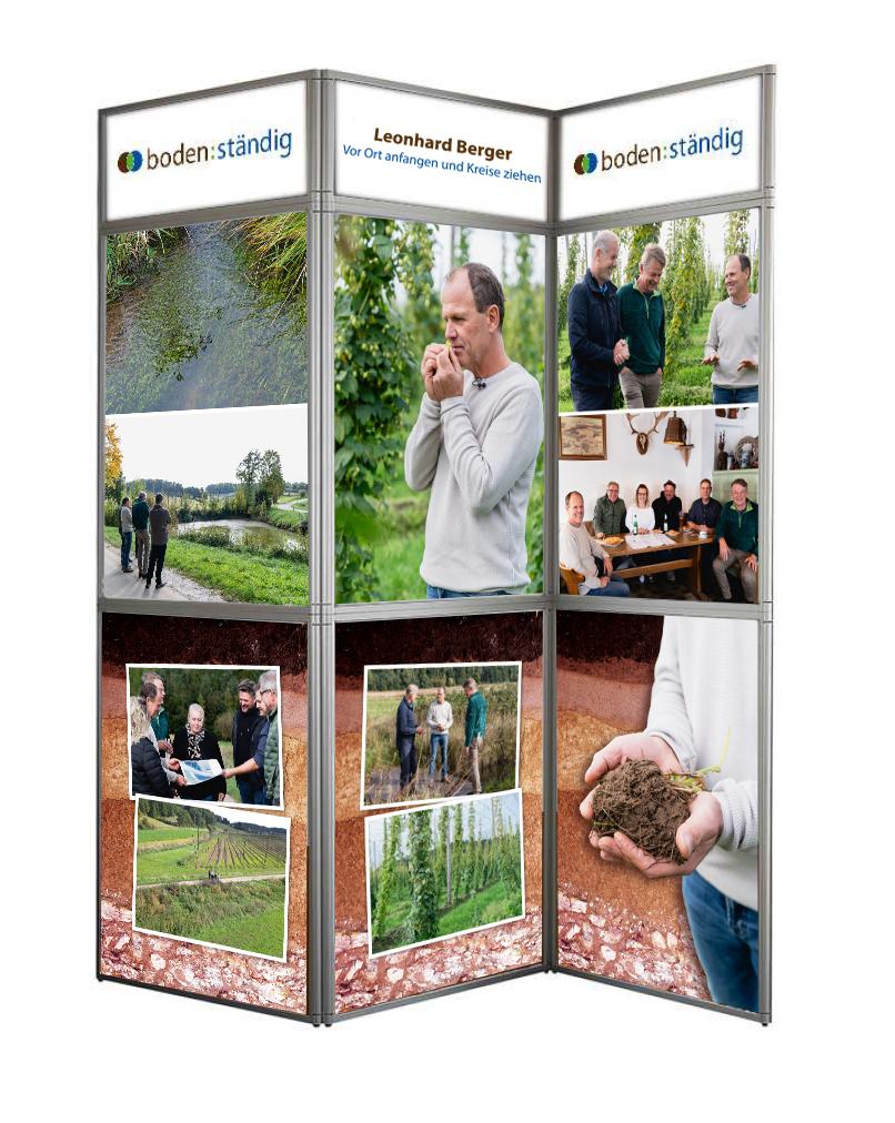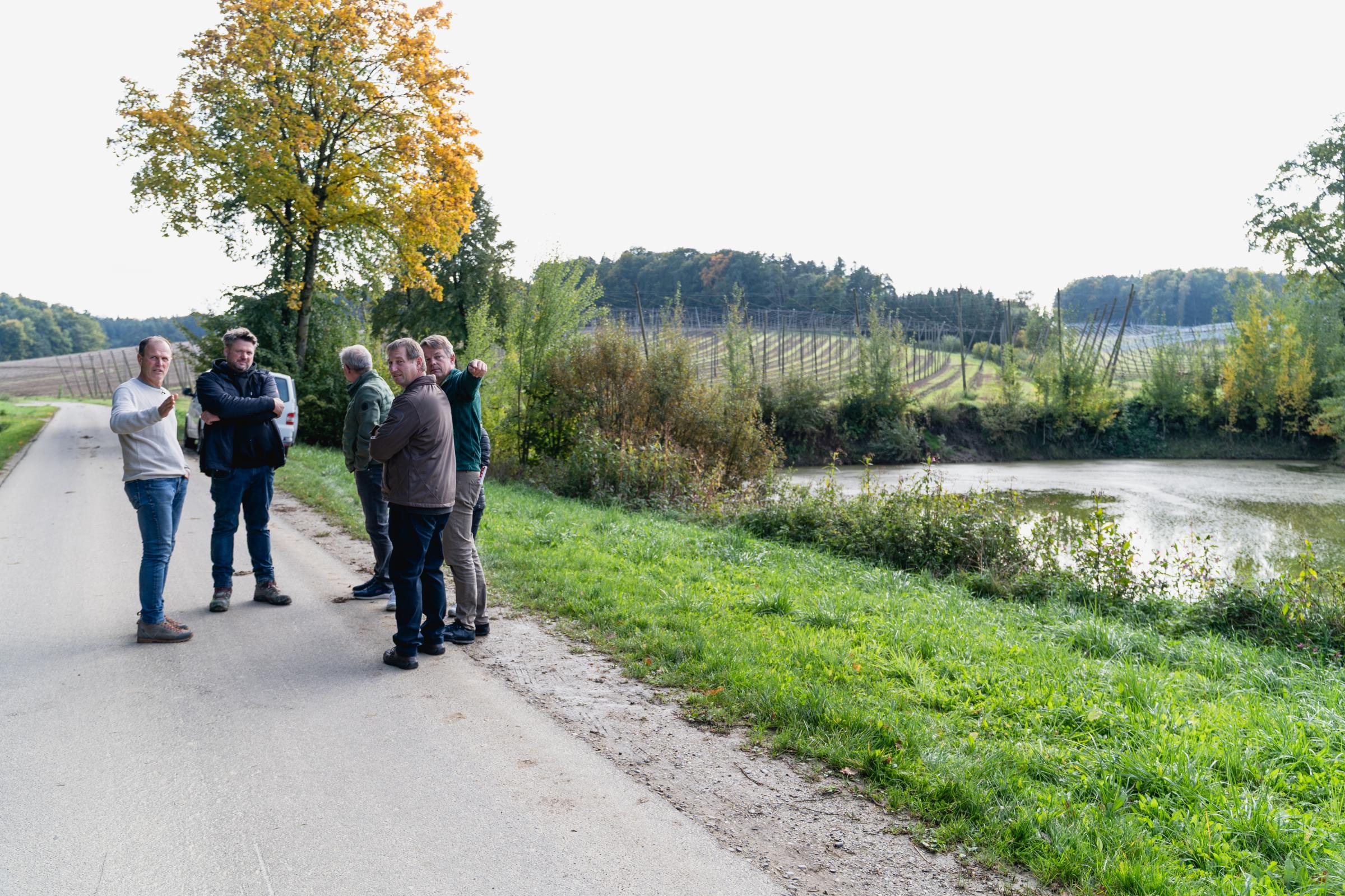 „Wir müssen jetzt handeln – auch wenn wir diese Maßnahme heute vielleicht noch nicht brauchen“ – damit formuliert er genau den Schwerpunkt des diesjähringen boden:ständig-Preis. Ein erstes Rückhaltebecken wurde schnell gebaut – weitere sind in der Ausplanung. Berger ist dabei wichtig, nicht nur auf Becken zu setzen – sondern viele flächensparende Maßnahmen in der Flur unterzubringen, wie Mulden, Weghöherlegungen etc. Und natürlich auch Maßnahmen auf den Flächen: Er ist selbst Hopfenbauer, zusammen mit den anderen verfeinert er stetig die Untersaaten im Hopfen. Und beteiligt sich am Projekt Hopfen NO3 zur Optimierung des Nitratkreislaufes im Hopfen.