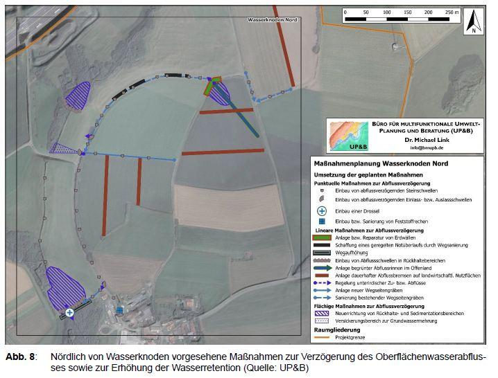 Das Gesamtkonzept sieht vor, über eine erosionsmindernde Bewirtschaftung der Flächen am Kreuzberg (z.B. Mulchsaat, Erosionsschutzstreifen etc.) Bodenersosion und Oberflächenabfluss möglichst zu vermeiden. Außerdem sollen Abflussschwellen im Graben den Wasserabflußverzögern und Sedimentmaterial möglichst frühzeitig auskämmen. Über dezentrale Rückhaltebereiche im Norden des Einzugsgebiets und eine mehrmalige Ableitung aus dem Graben in den Auenbereich soll der schnelle Wasserabfluß verlangsamt werden. Etwas 350 m nördlich des Ortsrandes gibt es einen in West-Ost-Richtung verlaufenden Weg, der auf einer Art Damm die Aue des Knodenbachs quert und als Abflussdrossel dienen könnte. Jedoch fließt das Wasser bisher über den Wegseitengraben am Talrand ab...