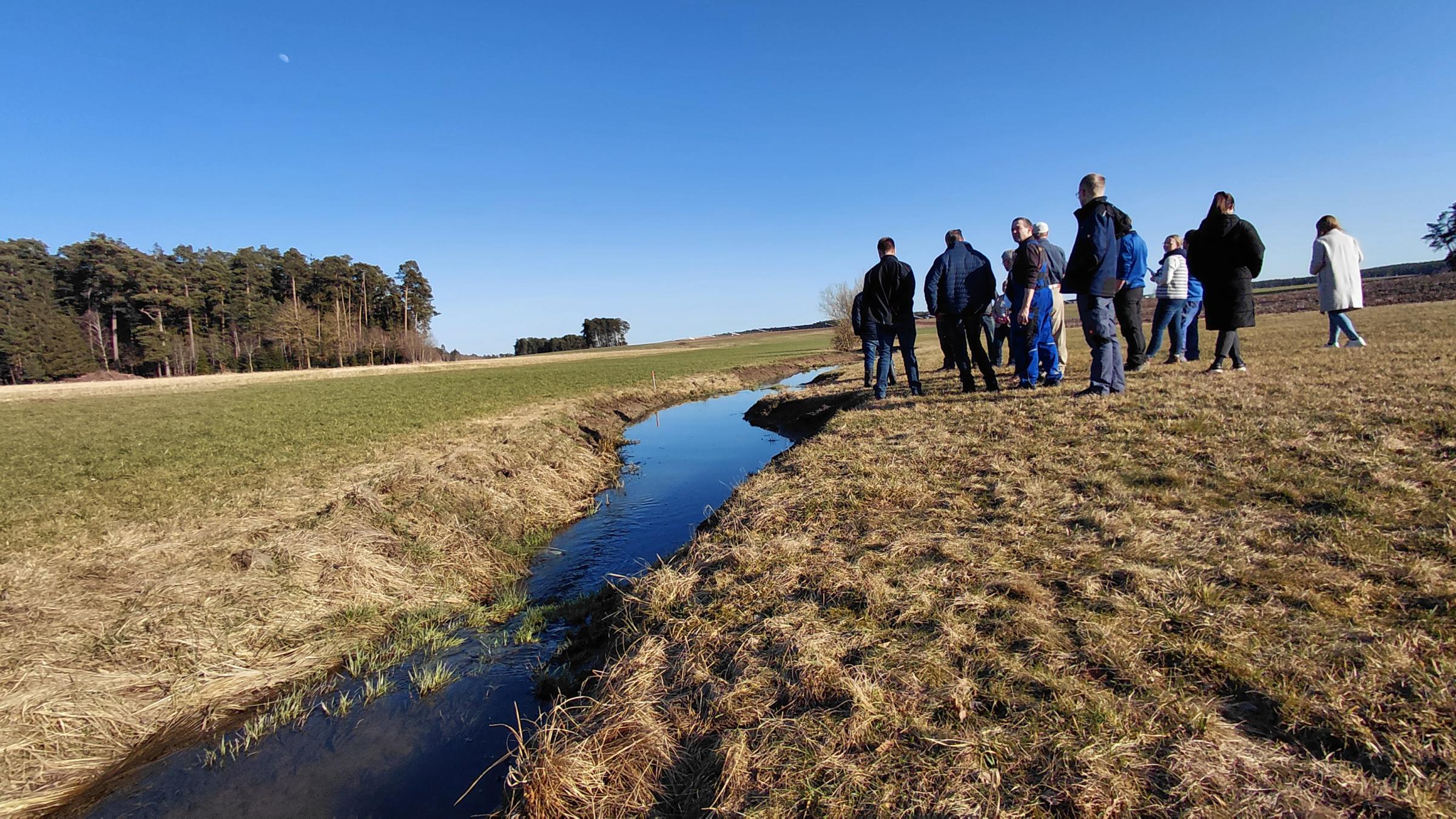 Auftakt der Exkursion war im Rathaus von Flachslanden. Dort stellten Herr Bürgermeister Henninger und der Biologe Herr Meßlinger die Hintergründe und Herausforderungen dar und zeigten zusätzlich konkrete Lösungsansätze und Entwicklungspotenziale auf. Seit dem großen Hochwasser im Jahr 2016 hat der Markt Flachslanden erhebliche Anstrengungen unternommen, die Situation in den Griff zu bekommen: Gräben und Gewässer wurden ökologisch aufgewertet und in einen nachhaltigeren Zustand überführt - mit Blick auf die Biodiversität, den Wasserrückhalt und den Erosionsschutz. So wurden unter anderem Störschwellen in Entwässerungsgräben eingebaut, Kleinstrückhalte geschaffen, Gewässer renaturiert und leistungsfähige landwirtschaftlich bewirtschaftbare Dammbauwerke errichtet, um den Abfluss in der Flur gezielt zu drosseln.