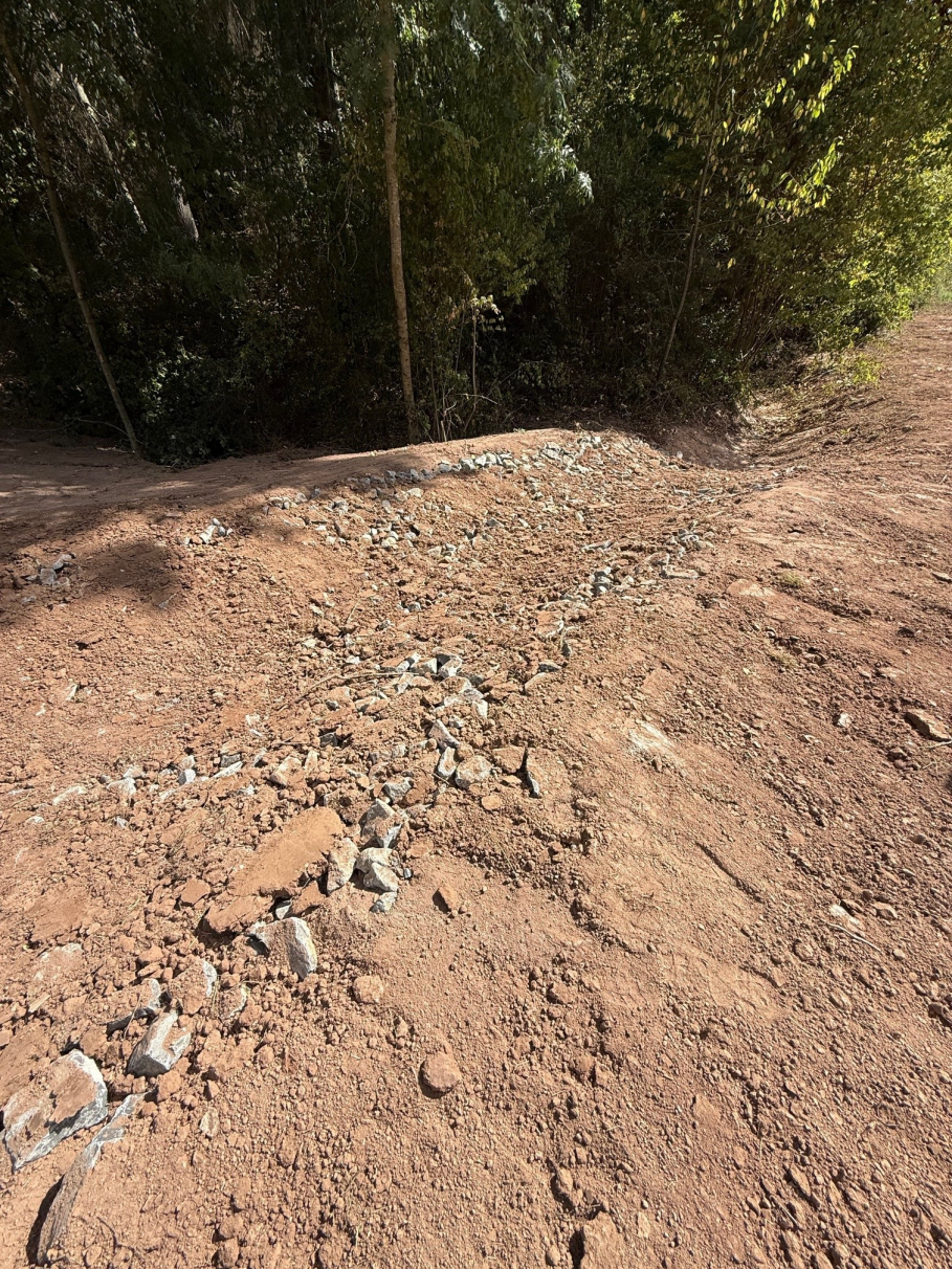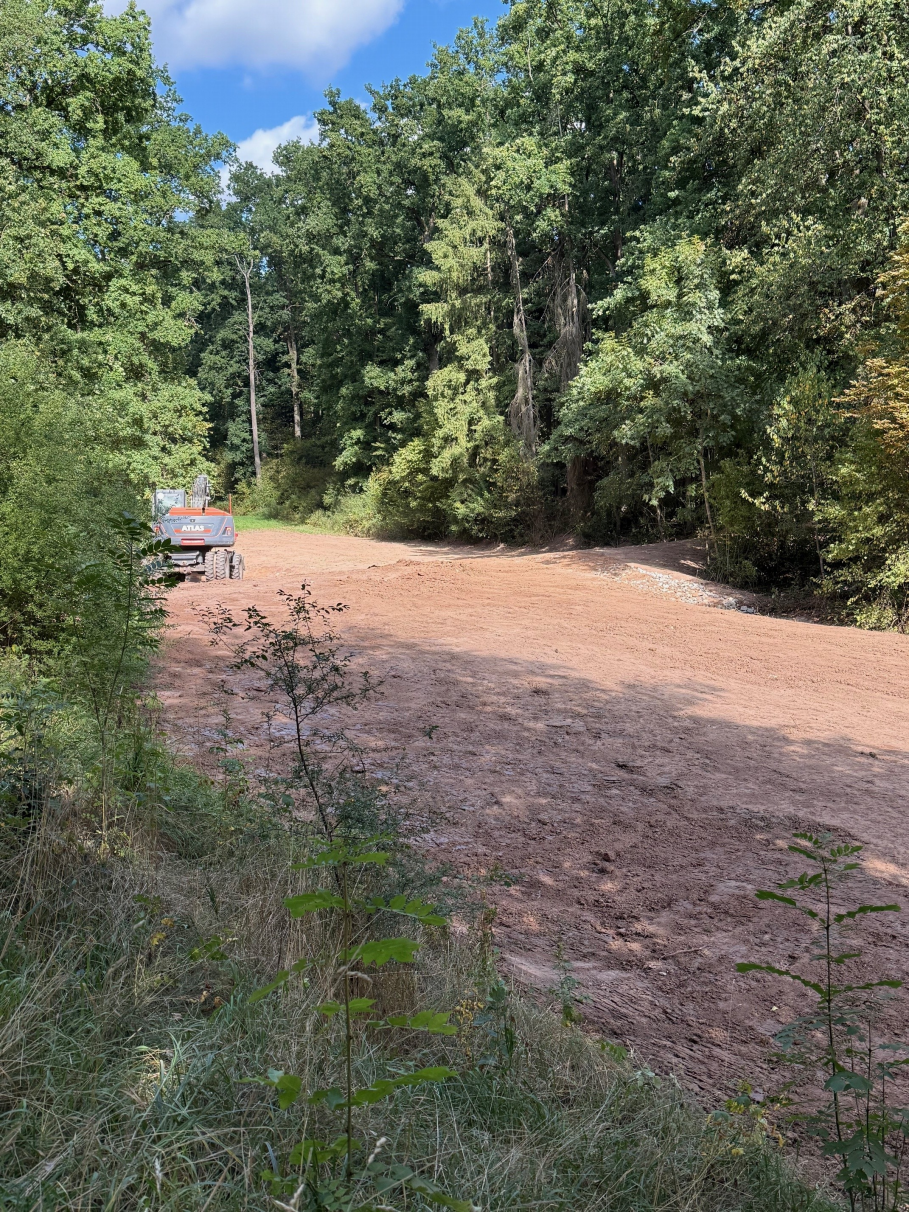 Um die anliegenden Gebäude besser vor unkontrollierten Oberflächenabflüssen und dem Eintrag von Sedimenten bei Starkregen zu schützen, wurden durch das GeoTeam in enger Abstimmung mit der Kommune, den Betroffenen vor Ort und dem Wasserwirtschaftsamt Kronach geeignete Maßnahmenvorschläge entwickelt. Auf Grundlage des boden:ständig-Konzepts konnten die Vorplanungen der Maßnahme M16 im August 2025 in Eigenregie der Gemeinde umgesetzt werden. Die Maßnahme umfasst die Anlage eines Erdwalls mit befestigtem Notüberlauf. Gleichzeitig bleibt die landwirtschaftliche Bewirtschaftung der Fläche weiterhin möglich. Ziel ist es, den unkontrollierten Oberflächenabfluss bei Starkregen gezielt zu verlangsamen sowie mitgeführte Sedimente und Nährstoffe in einem Absetzbecken zurückzuhalten. Das Absetzbecken vor der Aufwallung fördert zudem die Versickerung des Wassers und trägt damit positiv zur Grundwasserneubildung bei.