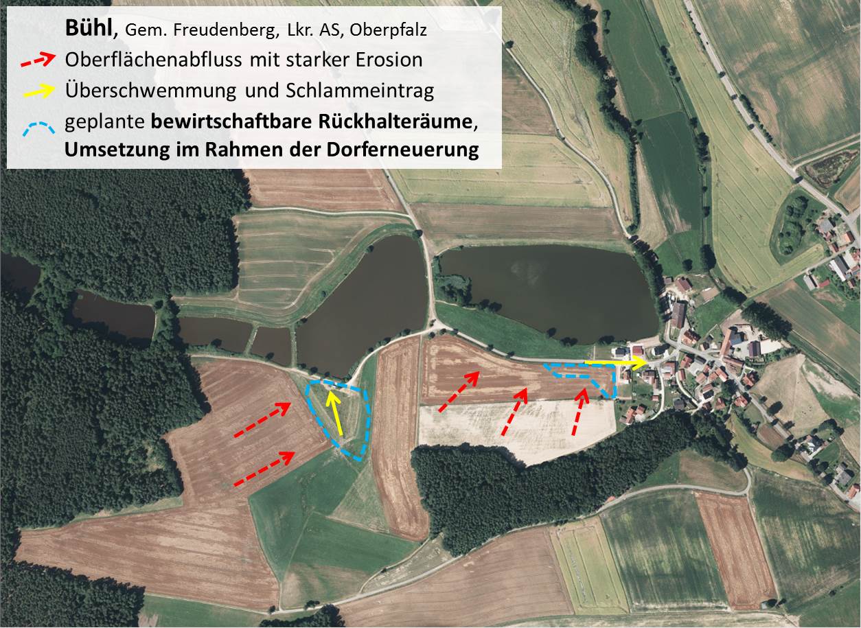Für die Ortschaft Bühl laufen seit 2014 die Vorbereitungsplanungen zu einem einfachen Dorferneuerungsprojekt. Bei den Abstimmungsterminen zwischen ALE, Fachplanern und Bürgern stellte sich heraus, dass der geplante neue Dorfplatz bei Starkregen durch Wasser und Schlamm aus ortsnahen Ackerlagen beeinträchtigt werden kann. Im Oktober 2014 vereinbarten Bürgermeister, ALE-Vertreter und Planer, die Problematik im Sinne der Initiative boden:ständig zu diskutieren und landwirtschaftliche Fachberater des AELF-Amberg hinzuzuziehen.