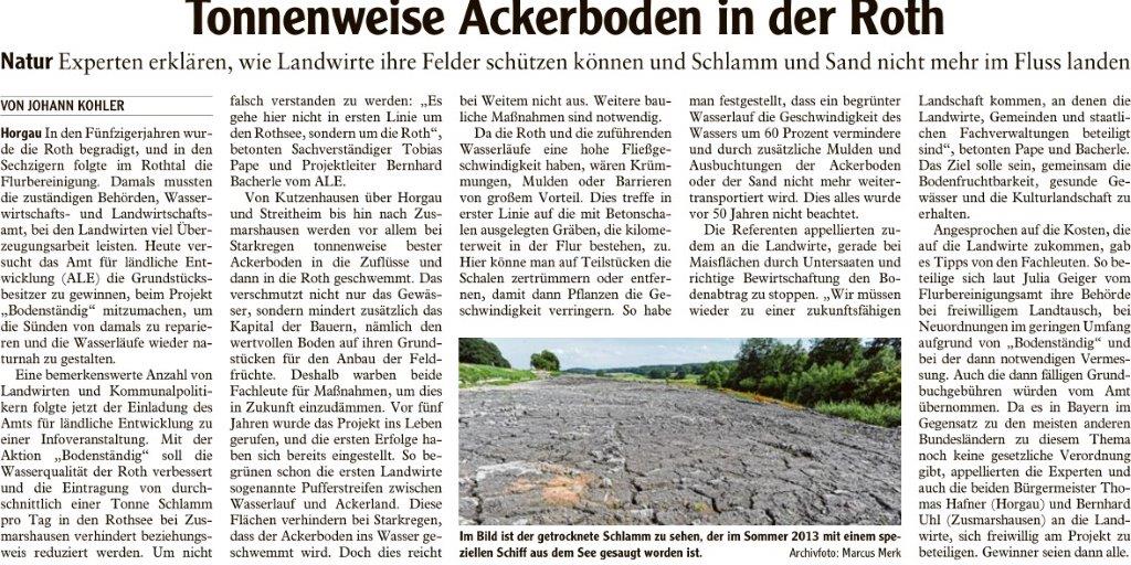 Der Rothsee bei Zusmarshausen ist ein Stausee aus den siebziger Jahren des letzten Jahrhunderts. Er biet Hochwasserschutz und ist ein beliebtes Freizeitgewässer. Gleichzeitig verlandet der See von Jahr zu Jahr mehr, weil die Roth nicht mehr ungehindert fließen kann. Außerdem wird durch stark begradigte Bäche im Einzugsgebiet und zunehmende Starkregenereignisse immer mehr Boden in die Roth und damit in den Rothsee gespült.