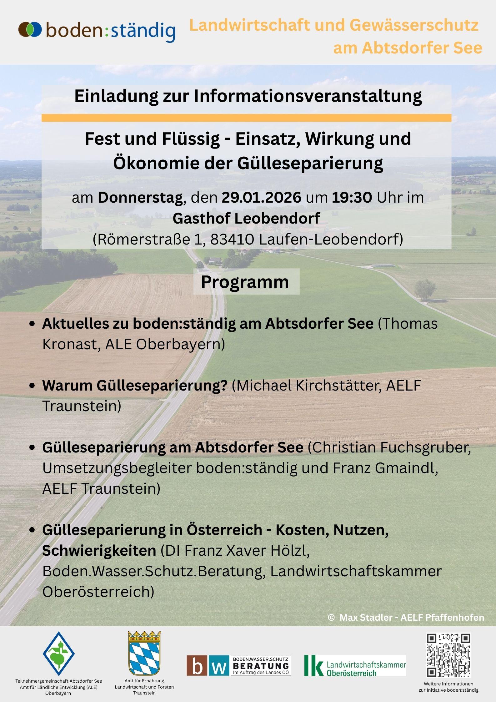 Die Antworten auf diese und viele Fragen mehr gibt Franz Xaver Hölzl, Referent Boden.Wasser.Schutz.Beratung der Landwirtschaftskammer Oberösterreich, bei einem Info-Abend des AELF Traunstein und des ALE Oberbayern am Donnerstag, 29. Januar 2026 um 19.30 Uhr im Gasthof Leobendorf.